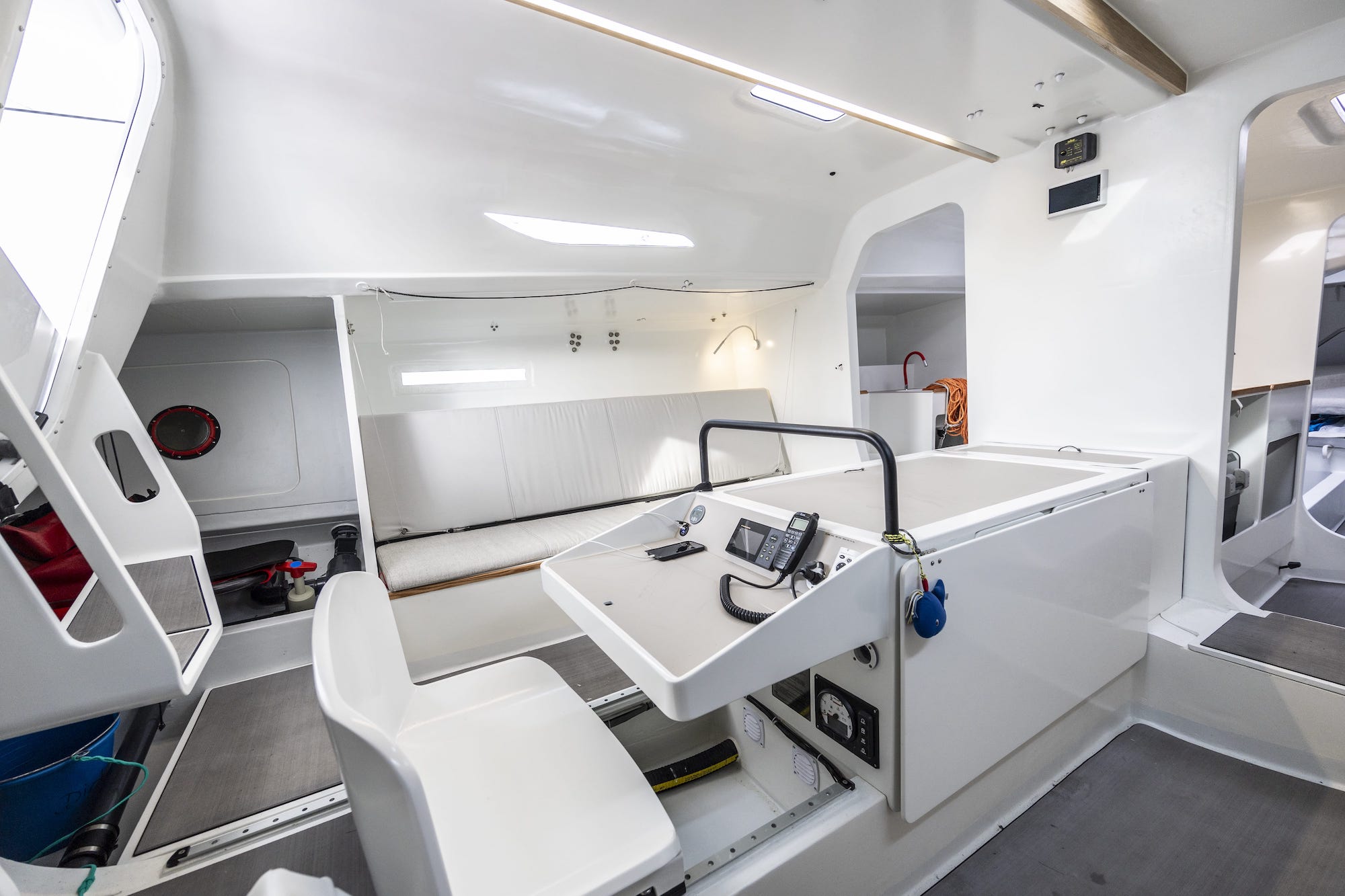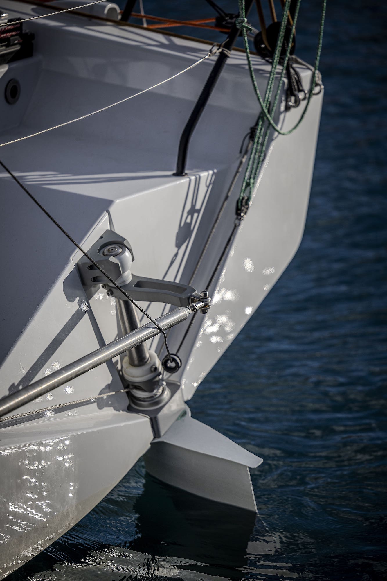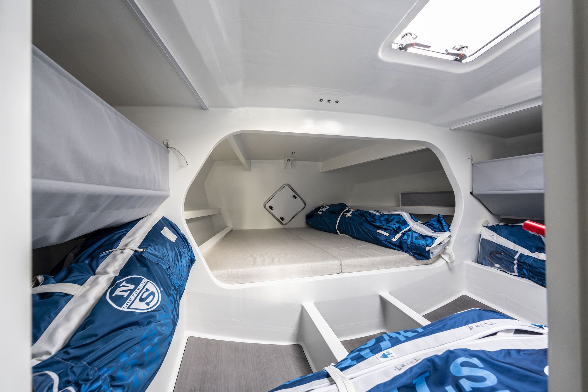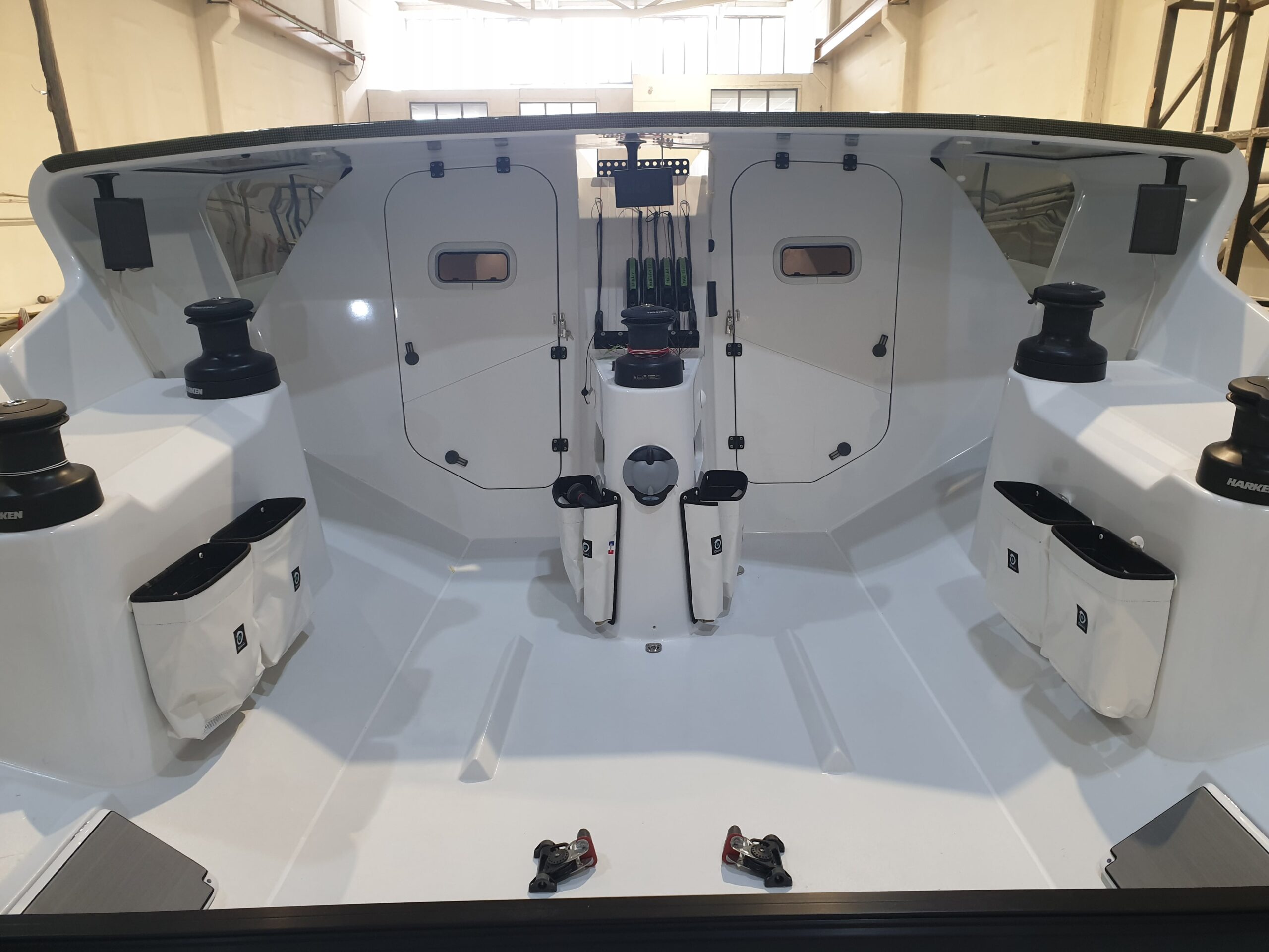 The RED2 is designed to push the limit in offshore sailing for a wide range of client profiles. Using the latest developments in open sea performance and handling, the solution is very similar to a Class40 concept with a longer hull to better accommodate the necessary interior and equipment. The hull shape solution is a development from 15 comparison models, all analysed using latest RANS Code CFD tool. The deck layout is optimised for a short-handed crew and offers multiple seating positions and protection. The cockpit is designed around two entry doors and a central pit console, resulting in a five-winch arrangement. All lines and halyards are run back into the cockpit area so that nearly all manoeuvres are possible inside a protected space. Above deck, the rig and sail plan are optimised for offshore operation and for the IRC rating system. The aim is to reduce all possible performance gaps with the use of flying reaching sails and staysails. That setup helps to improve the boat’s behaviour in heavy sea state conditions, to keep it balanced and to reduce nose-diving. For better control and safety, the boat is equipped with lifting twin rudders. The keel is made from high-strength steel with composite fairing, connected to a lead bulb at 3.0m draught. The use of 750L water ballast divided in 3 tanks on each side allows greater performance and weight reduction for the concept. The water ballast is operated from the cockpit.