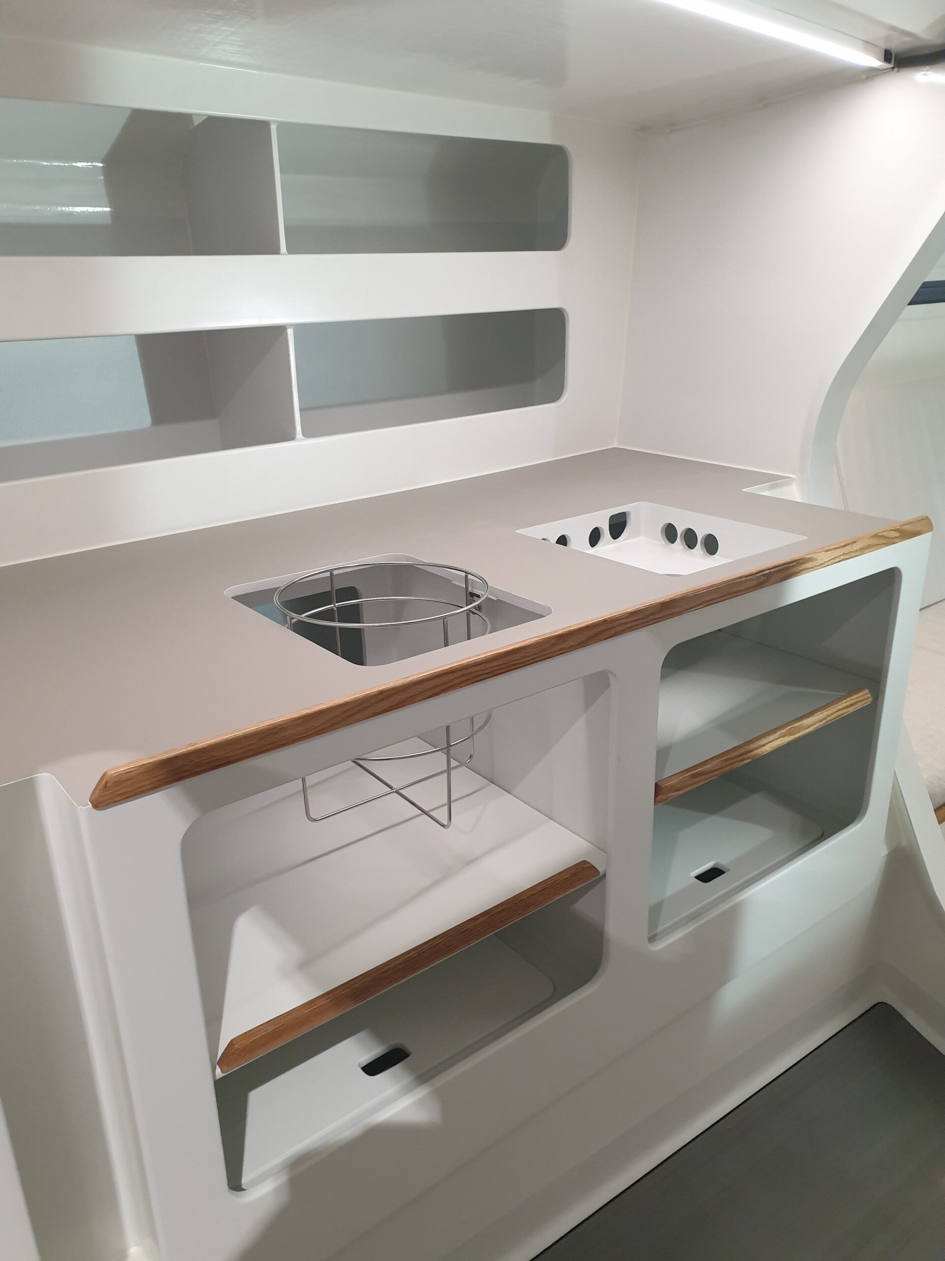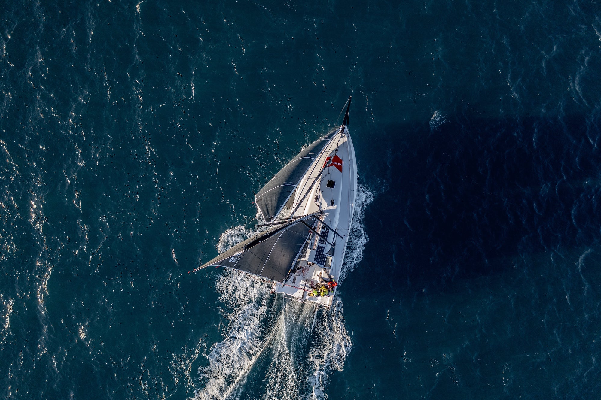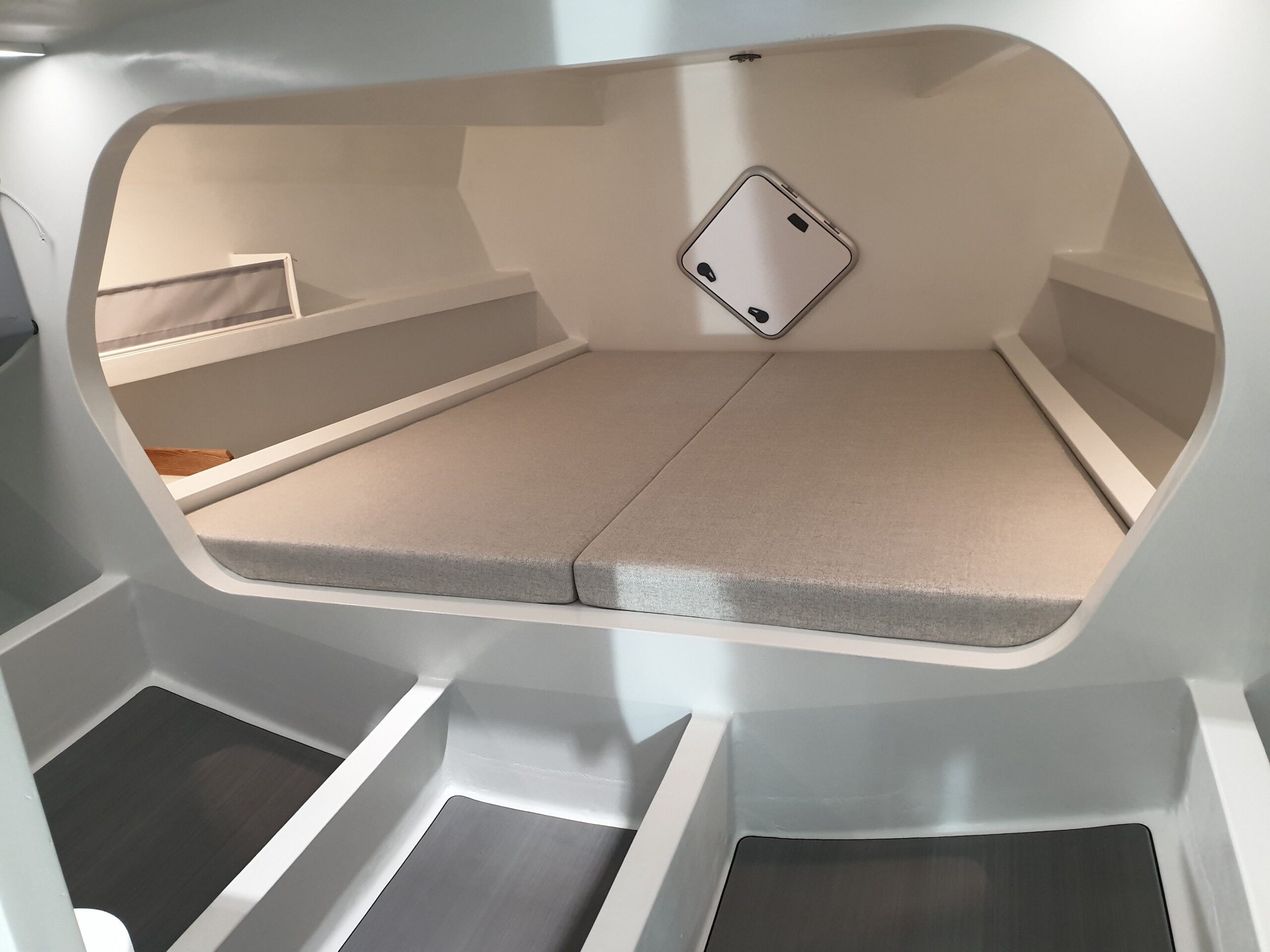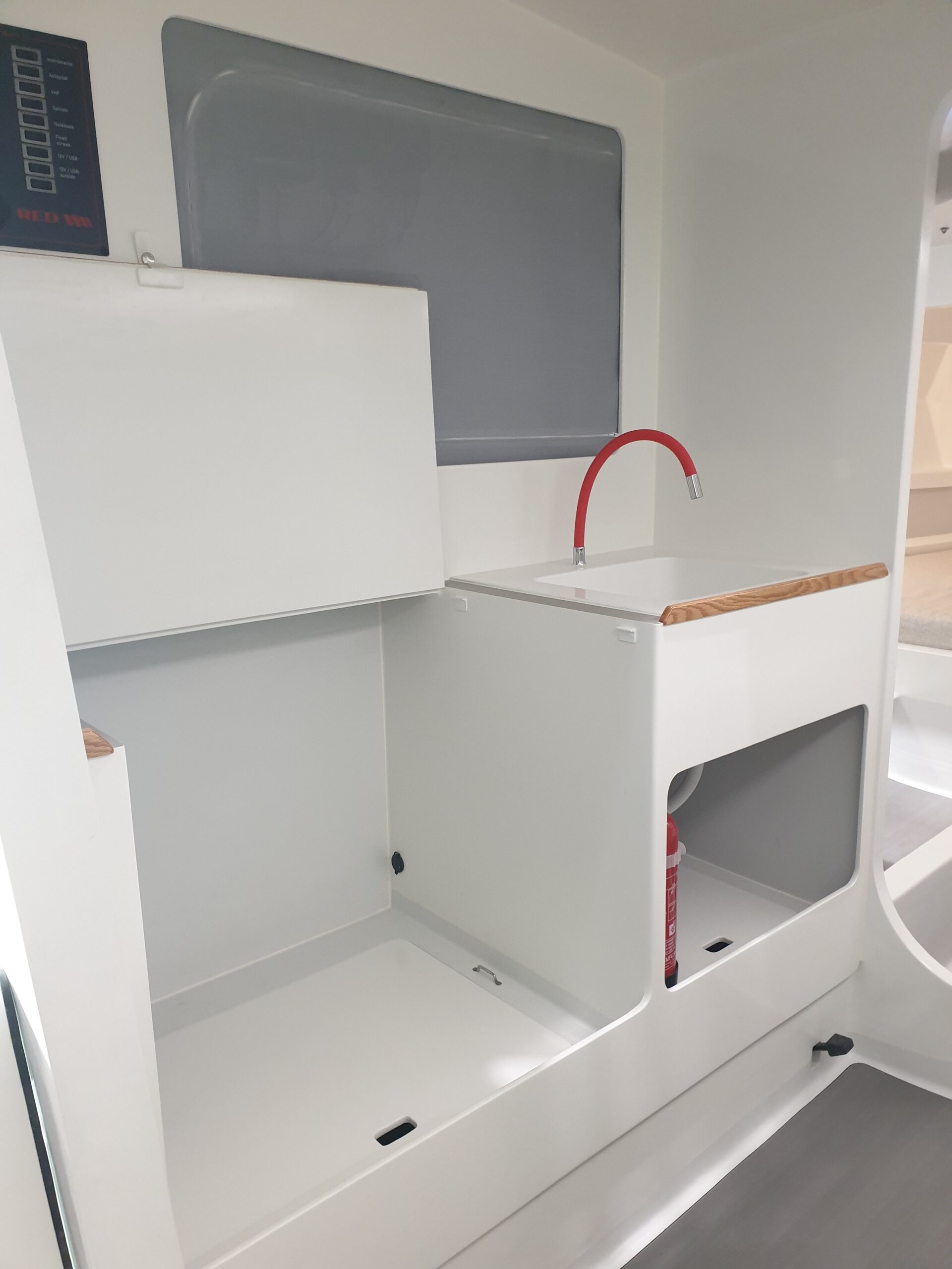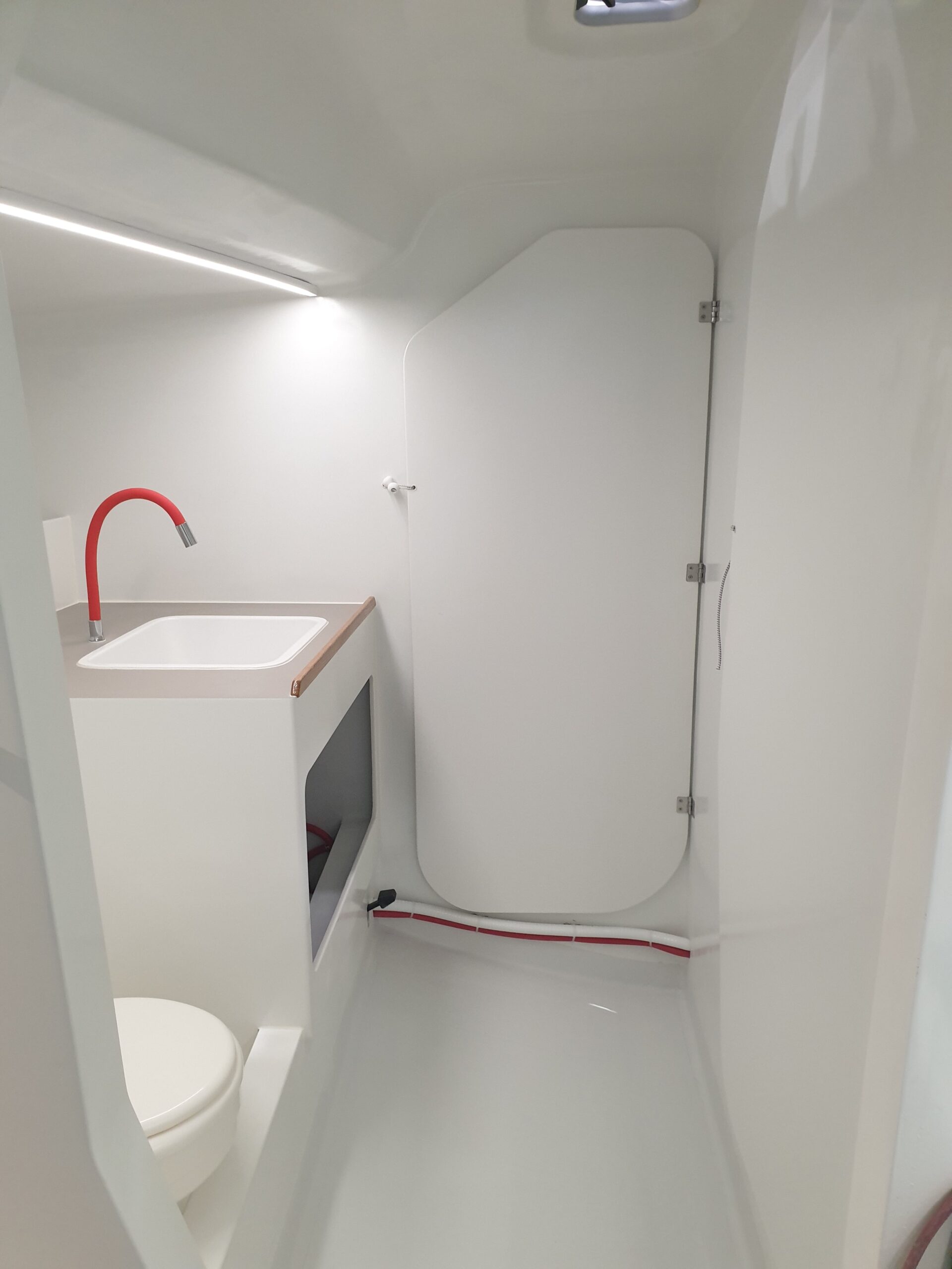 The RED2 is designed to push the limit in offshore sailing for a wide range of client profiles. Using the latest developments in open sea performance and handling, the solution is very similar to a Class40 concept with a longer hull to better accommodate the necessary interior and equipment. The hull shape solution is a development from 15 comparison models, all analysed using latest RANS Code CFD tool. The deck layout is optimised for a short-handed crew and offers multiple seating positions and protection. The cockpit is designed around two entry doors and a central pit console, resulting in a five-winch arrangement. All lines and halyards are run back into the cockpit area so that nearly all manoeuvres are possible inside a protected space. Above deck, the rig and sail plan are optimised for offshore operation and for the IRC rating system. The aim is to reduce all possible performance gaps with the use of flying reaching sails and staysails. That setup helps to improve the boat’s behaviour in heavy sea state conditions, to keep it balanced and to reduce nose-diving. For better control and safety, the boat is equipped with lifting twin rudders. The keel is made from high-strength steel with composite fairing, connected to a lead bulb at 3.0m draught. The use of 750L water ballast divided in 3 tanks on each side allows greater performance and weight reduction for the concept. The water ballast is operated from the cockpit.