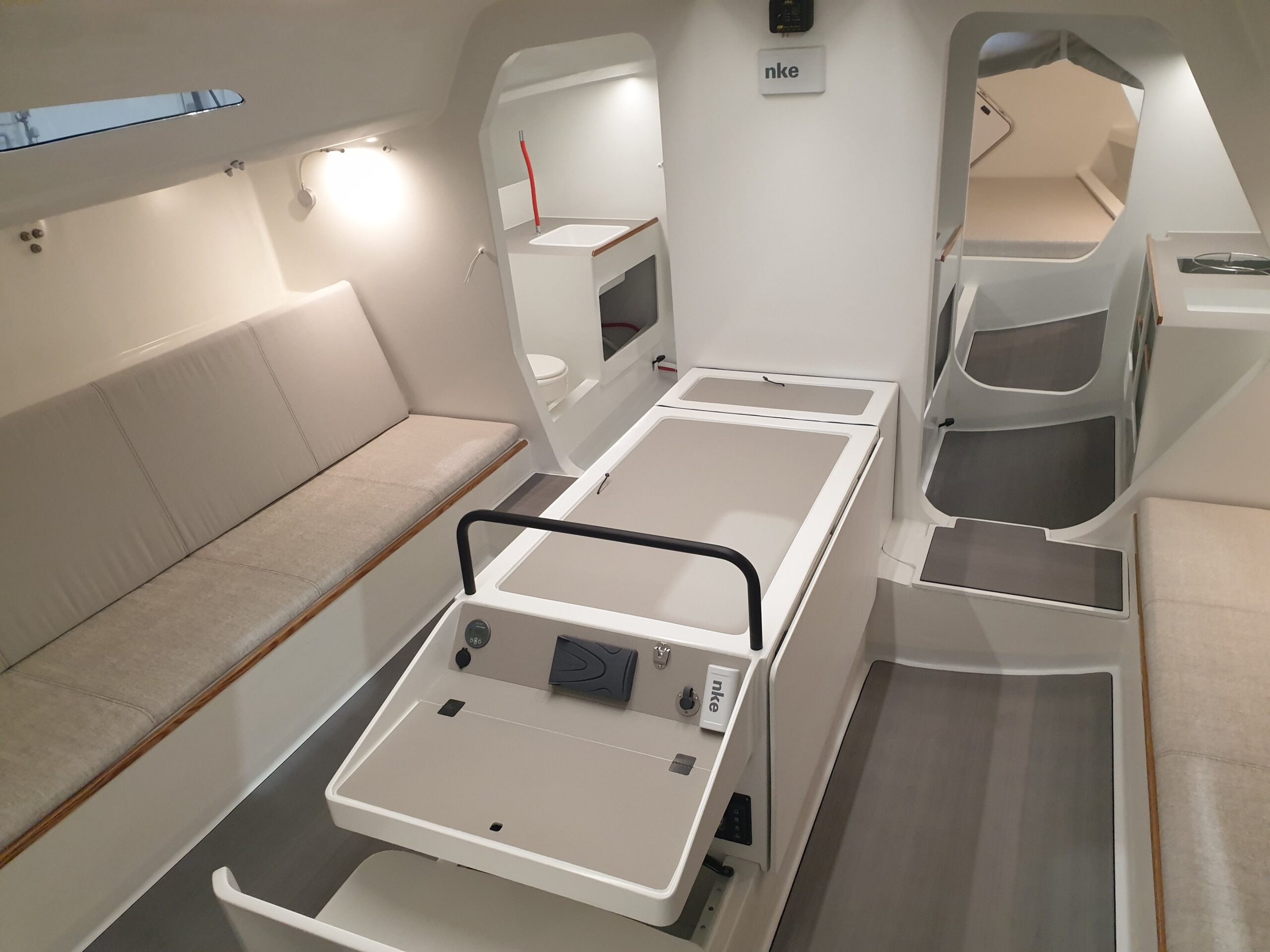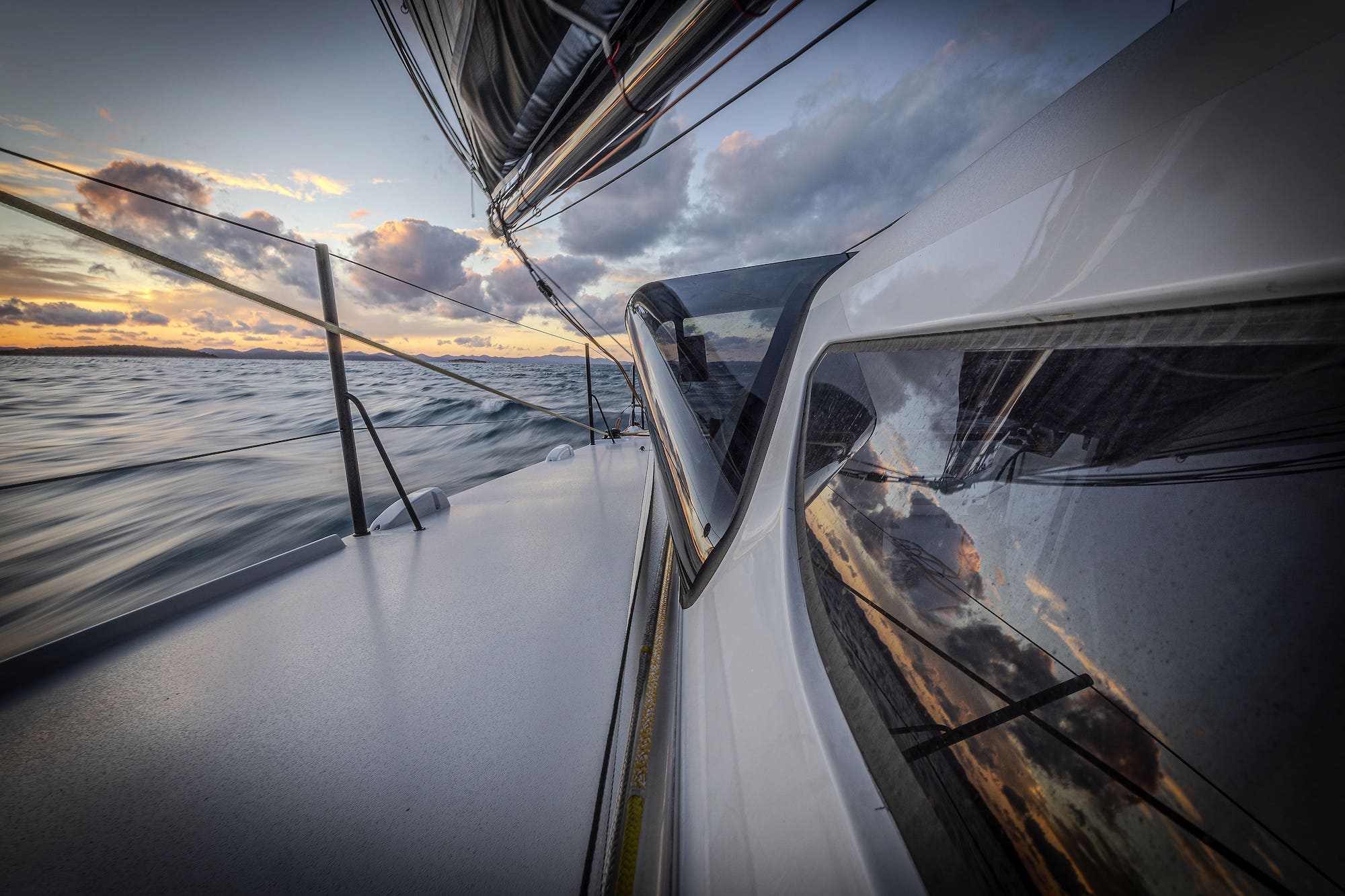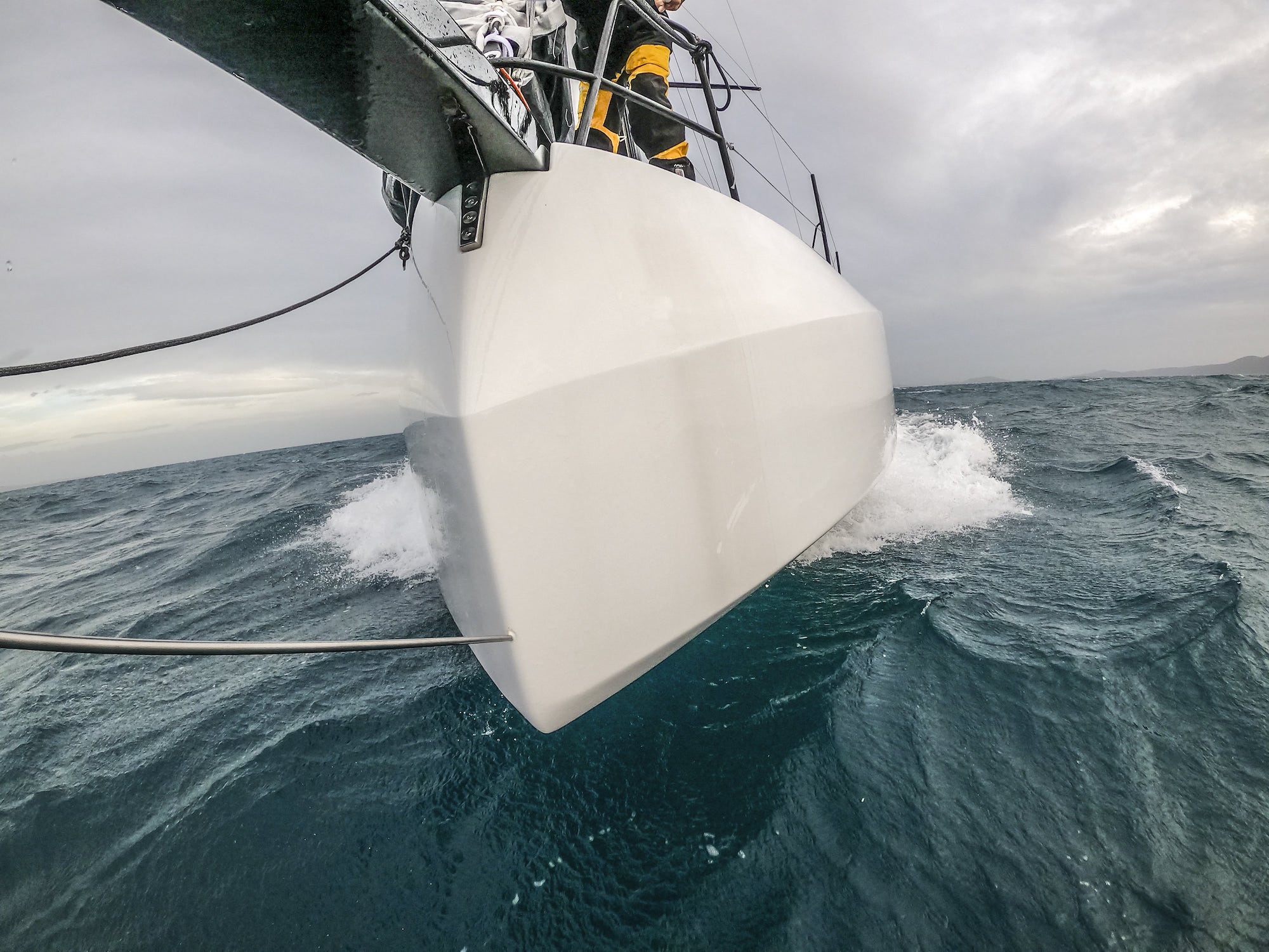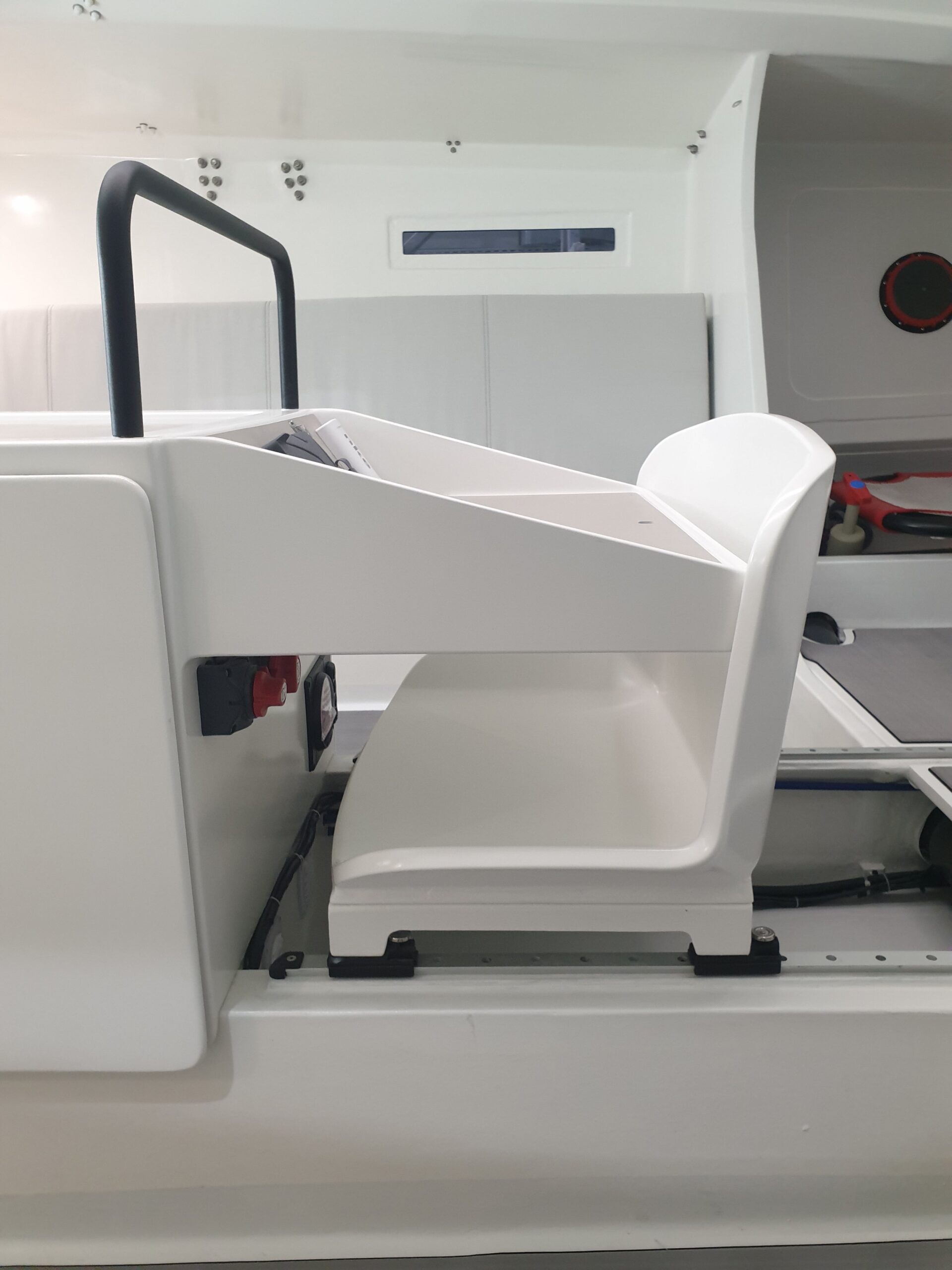 The RED2 is designed to push the limit in offshore sailing for a wide range of client profiles. Using the latest developments in open sea performance and handling, the solution is very similar to a Class40 concept with a longer hull to better accommodate the necessary interior and equipment. The hull shape solution is a development from 15 comparison models, all analysed using latest RANS Code CFD tool. The deck layout is optimised for a short-handed crew and offers multiple seating positions and protection. The cockpit is designed around two entry doors and a central pit console, resulting in a five-winch arrangement. All lines and halyards are run back into the cockpit area so that nearly all manoeuvres are possible inside a protected space. Above deck, the rig and sail plan are optimised for offshore operation and for the IRC rating system. The aim is to reduce all possible performance gaps with the use of flying reaching sails and staysails. That setup helps to improve the boat’s behaviour in heavy sea state conditions, to keep it balanced and to reduce nose-diving. For better control and safety, the boat is equipped with lifting twin rudders. The keel is made from high-strength steel with composite fairing, connected to a lead bulb at 3.0m draught. The use of 750L water ballast divided in 3 tanks on each side allows greater performance and weight reduction for the concept. The water ballast is operated from the cockpit.
