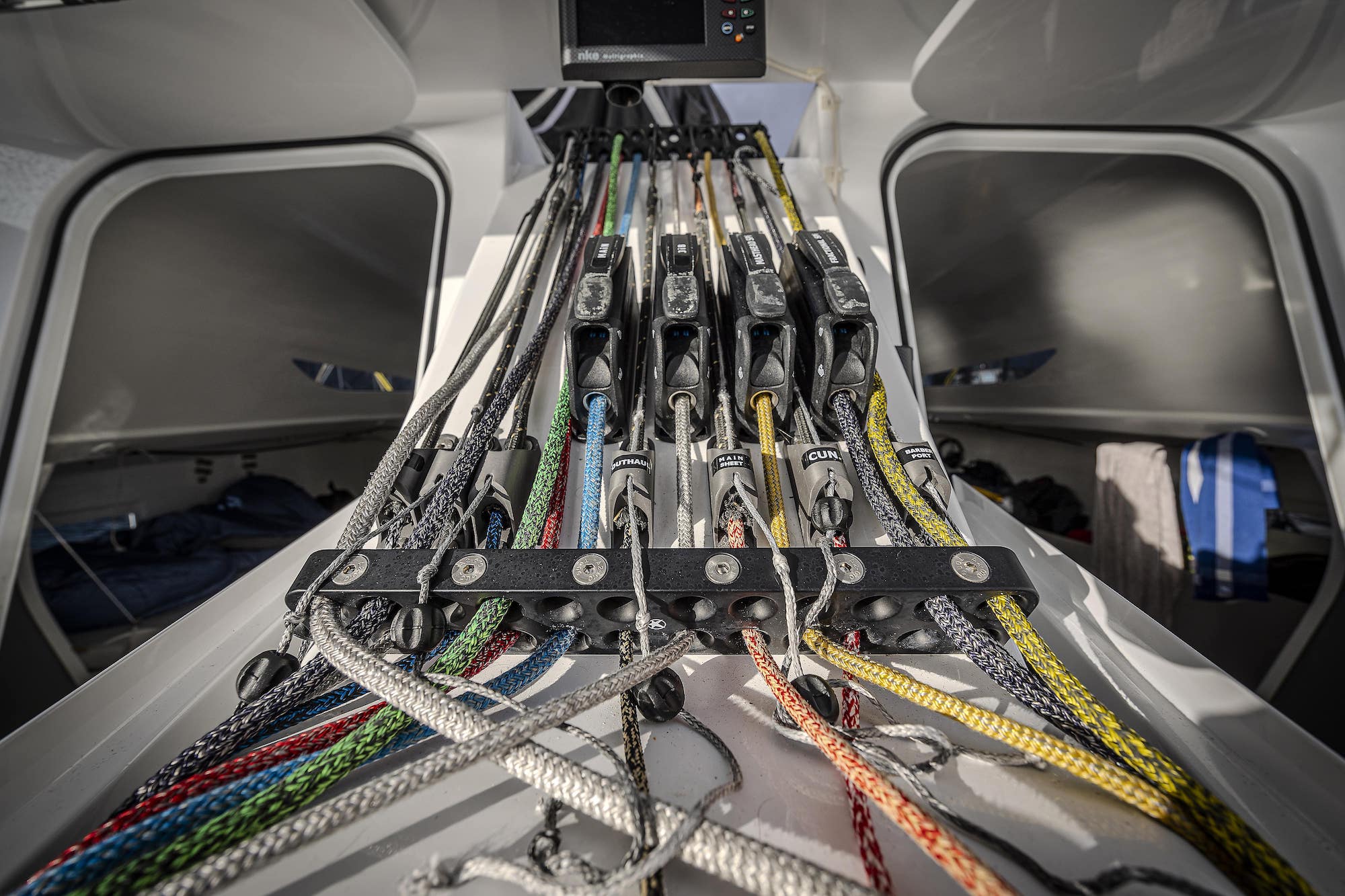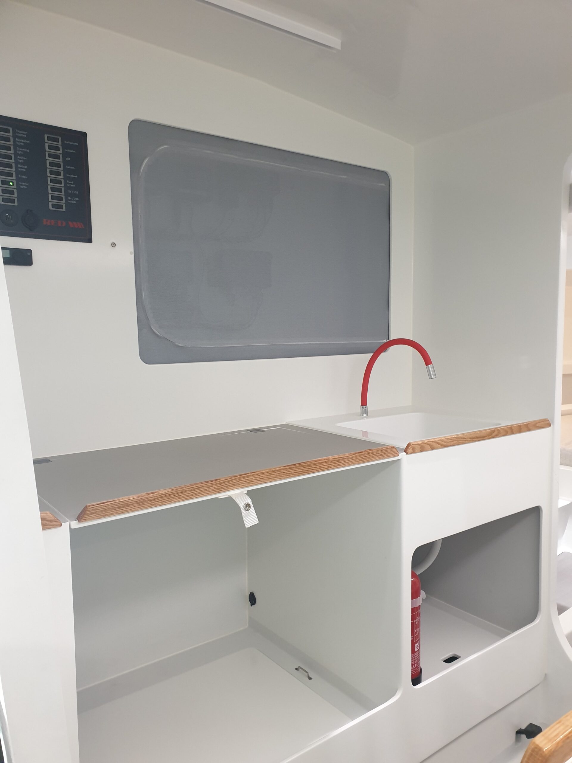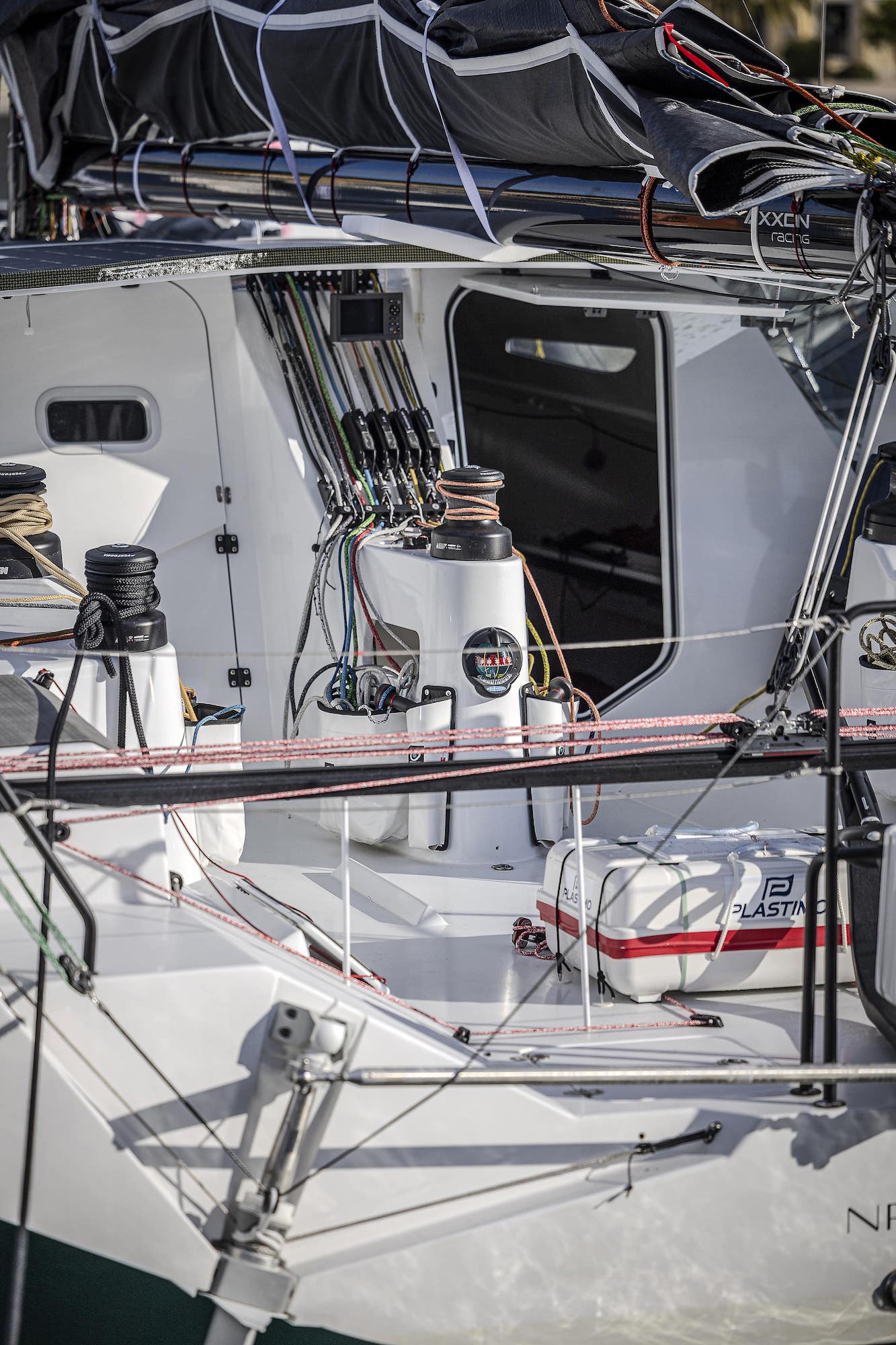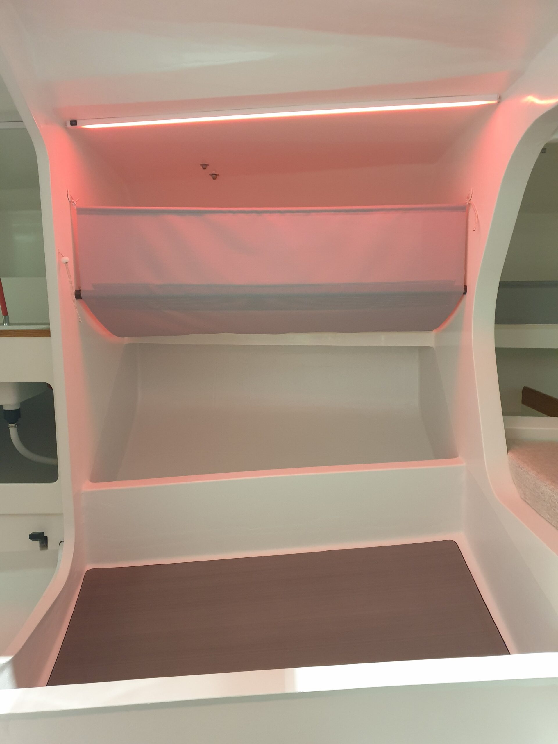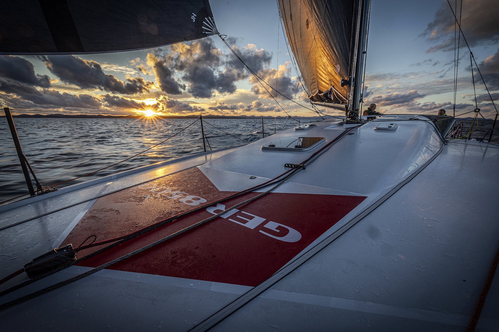 The RED2 is designed to push the limit in offshore sailing for a wide range of client profiles. Using the latest developments in open sea performance and handling, the solution is very similar to a Class40 concept with a longer hull to better accommodate the necessary interior and equipment. The hull shape solution is a development from 15 comparison models, all analysed using latest RANS Code CFD tool. The deck layout is optimised for a short-handed crew and offers multiple seating positions and protection. The cockpit is designed around two entry doors and a central pit console, resulting in a five-winch arrangement. All lines and halyards are run back into the cockpit area so that nearly all manoeuvres are possible inside a protected space. Above deck, the rig and sail plan are optimised for offshore operation and for the IRC rating system. The aim is to reduce all possible performance gaps with the use of flying reaching sails and staysails. That setup helps to improve the boat’s behaviour in heavy sea state conditions, to keep it balanced and to reduce nose-diving. For better control and safety, the boat is equipped with lifting twin rudders. The keel is made from high-strength steel with composite fairing, connected to a lead bulb at 3.0m draught. The use of 750L water ballast divided in 3 tanks on each side allows greater performance and weight reduction for the concept. The water ballast is operated from the cockpit.